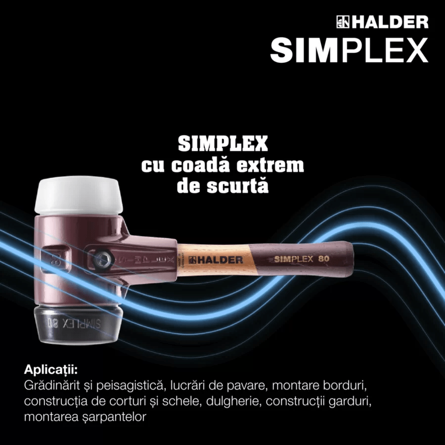 Acesta este cel mai moale cap din seria SIMPLEX, are un efect puternic de amortizare şi, prin urmare, este adecvat pentru lucrări sensibile. Comparativ cu un ciocan de cauciuc convenţional, el nu lasă nicio abraziune neagră.