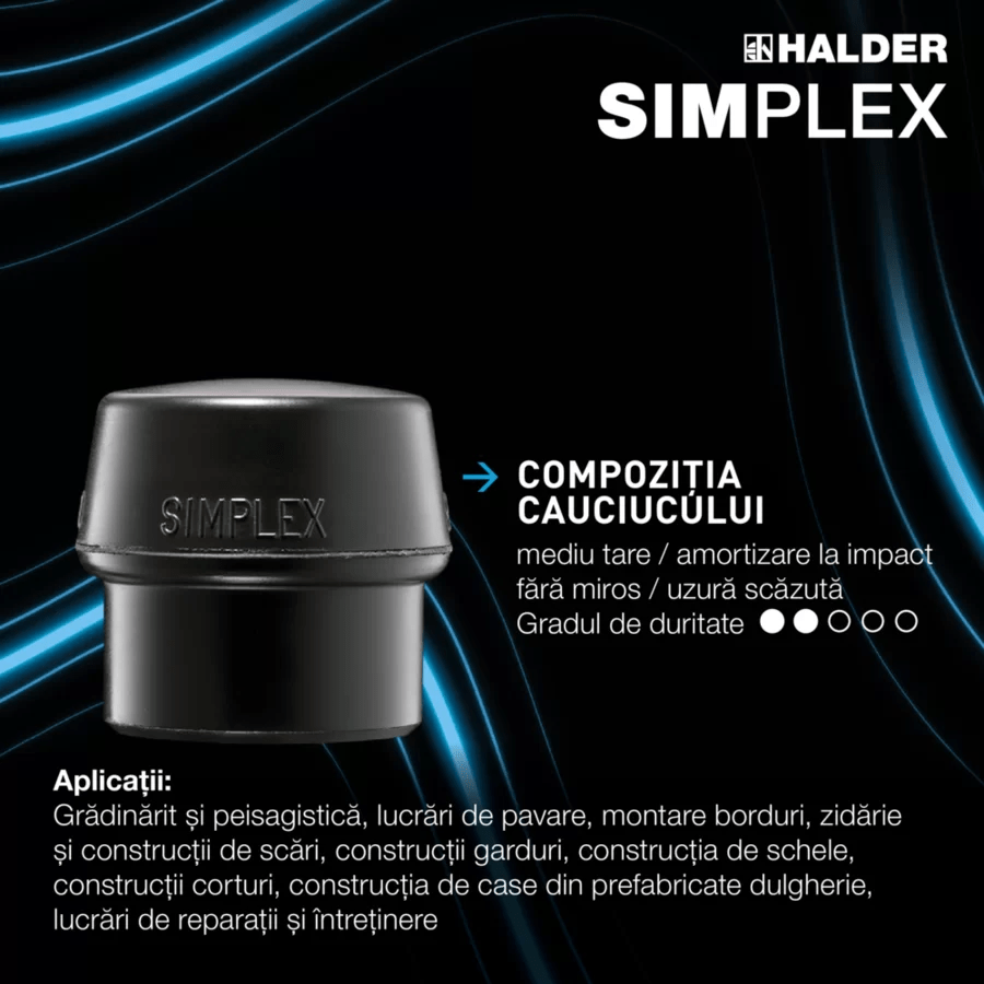 Inserţia TPE-moale albastru (seria 3201) este cel mai moale cap din seria SIMPLEX, are un efect puternic de amortizare şi, prin urmare, este adecvat pentru lucrări sensibile. Comparativ cu un ciocan de cauciuc convenţional, el nu lasă nicio abraziune neagră.