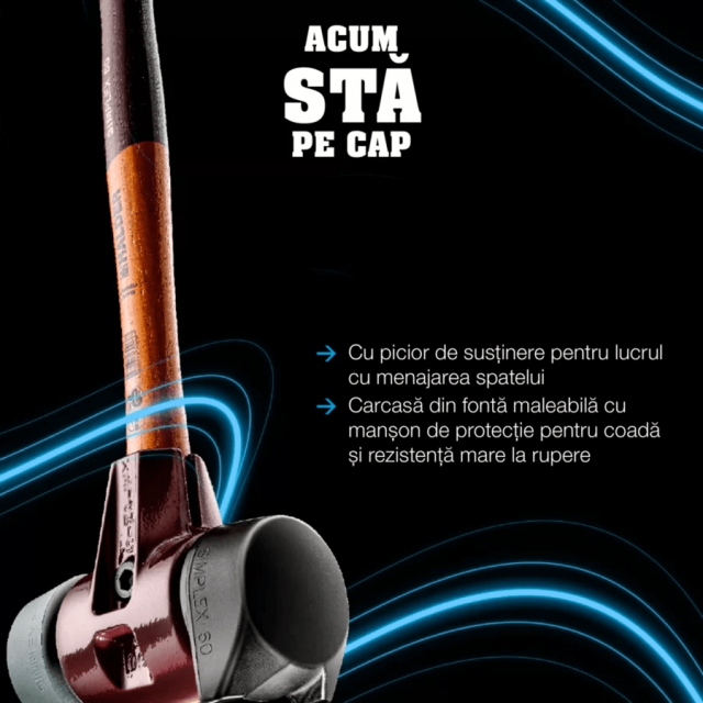 Forma ingenioasă a inserşiei de cauciuc cu picior de susţinere (3202.2) asigură faptul că ciocanul stă în siguranţă pe cap, nefiind nevoie de aplecarea utilizatorului, ceea ce face munca mult mai ergonomică şi mai menajantă pentru spate. Amestecul de cauciuc consacrat prezintă o uzură foarte scăzută, amortizare la impact şi este inodor, ţinând mult mai mult decât un ciocan din cauciuc convenţional.