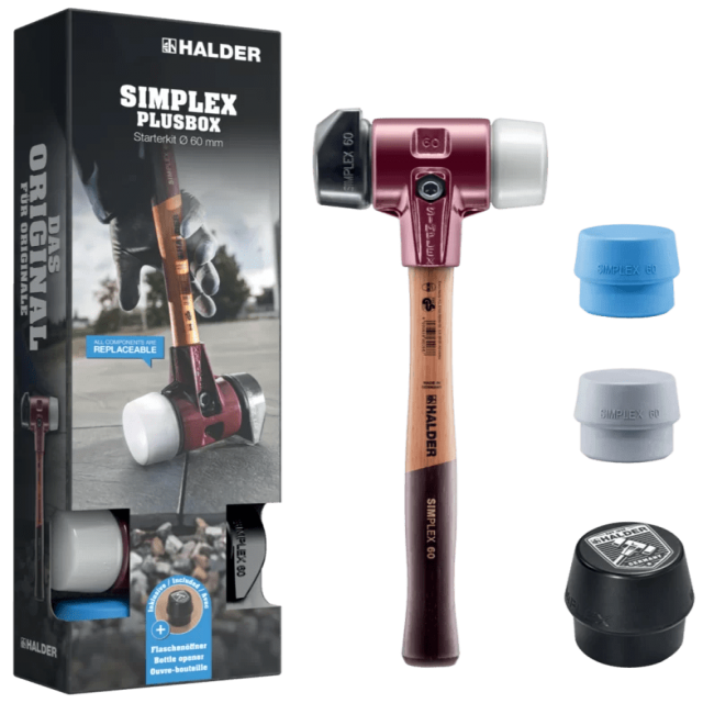 Acest kit de start SIMPLEX Plus Box conține ciocanul cu cap moale SIMPLEX D60, cu inserții din compoziție de cauciuc cu funcție „stand-up” / superplastic, precum și o inserție TPE-soft și una TPE-mid, plus un deschizător de sticle SIMPLEX Push.