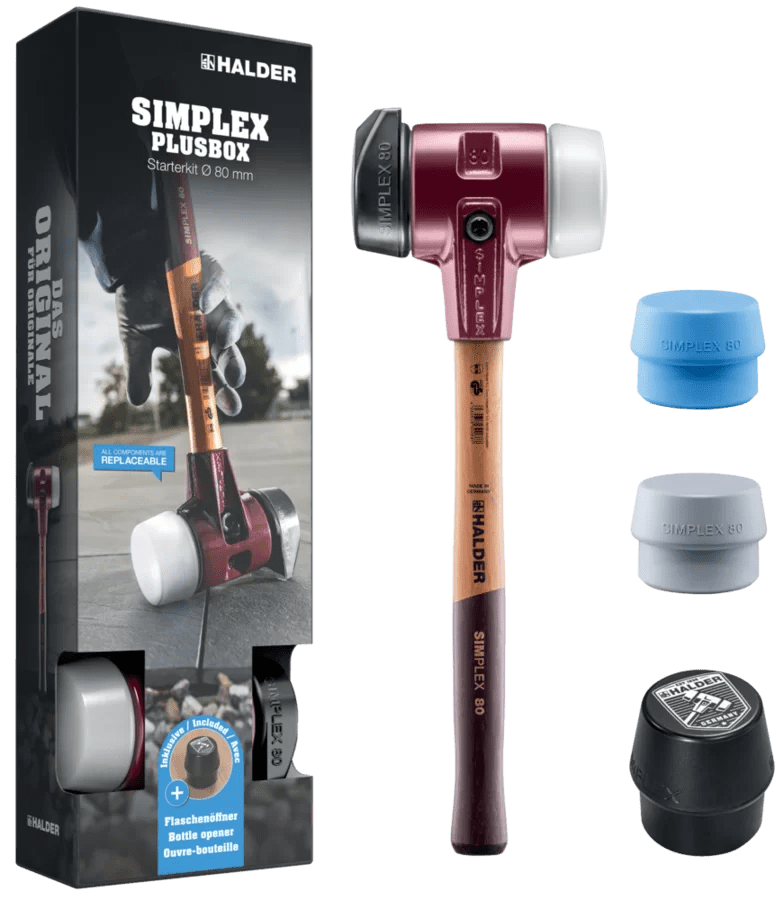 Acest kit de start SIMPLEX PLUS BOX conține ciocanul cu cap moale SIMPLEX D80, cu inserții din cauciuc compozit cu funcție „stand-up” / superplastic, precum și o inserție TPE-soft și una TPE-mid, plus un deschizător de sticle SIMPLEX Push.