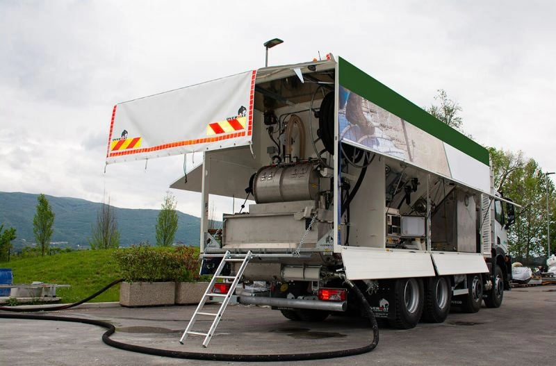 Это единственное оборудование на рынке, которое производит как легкую стяжку (пена и полистирол), так и заранее приготовленную жидкую стяжку в один и тот же день, загружая два разных связующих в специальные отсеки машины.
