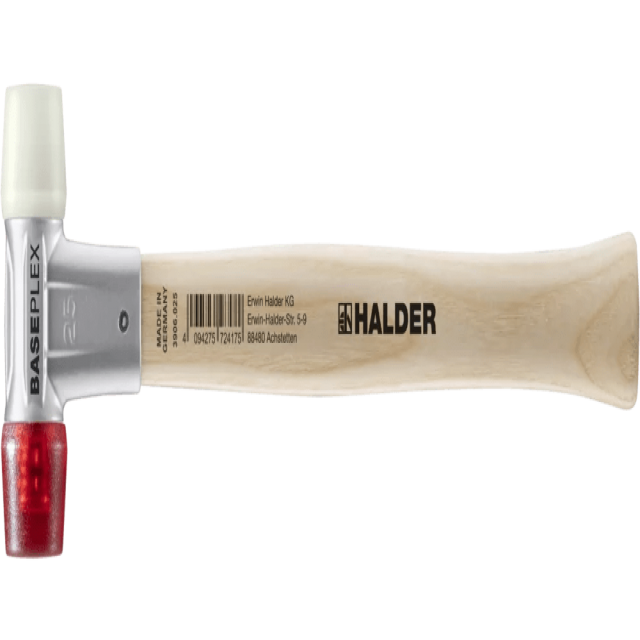 Молоток BASEPLEX с мягкими ударными вставками: комбинация ацетата целлюлозы (красный, твёрдый, устойчивый к маслам и жирам) и нейлона (белый, износостойкий).