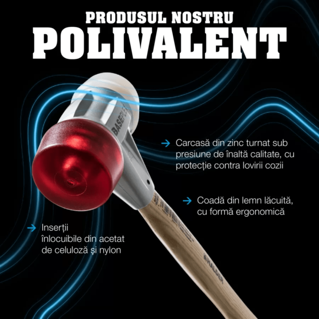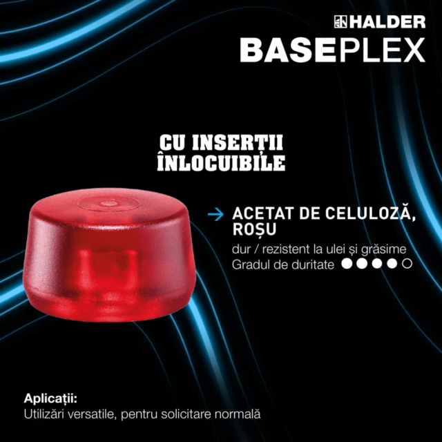 Молоток BASEPLEX с мягкими ударными вставками: комбинация ацетата целлюлозы (красный, твёрдый, устойчивый к маслам и жирам) и нейлона (белый, износостойкий).