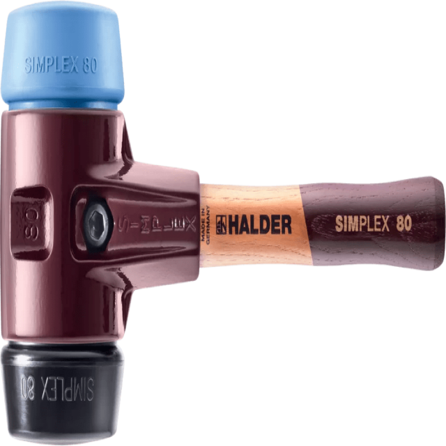 Синий боёк из TPE-мягкого материала (серия 3201) — самый мягкий в линейке SIMPLEX, обладает сильным амортизирующим эффектом и идеально подходит для деликатных работ. В отличие от обычных резиновых молотков, не оставляет тёмных следов.