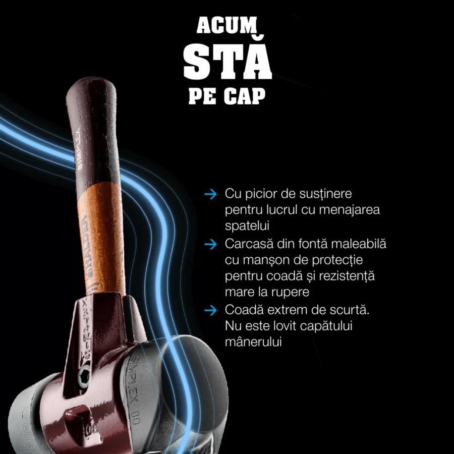Этот молоток SIMPLEX с мягкой ударной головкой оснащён очень короткой рукояткой. Компактная конструкция предотвращает касание конца рукоятки о землю.