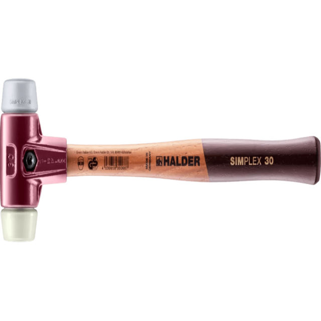 Изделие 3038.030 – молоток SIMPLEX с мягкими бойками TPE средней твёрдости / нейлон, с корпусом из чугуна и высококачественной деревянной рукояткой (Ø: 30 мм), является вариантом линейки изделий молотки SIMPLEX с бойками TPE средней твёрдости / нейлон, с чугунным корпусом и деревянной рукояткой (EH 3038.)