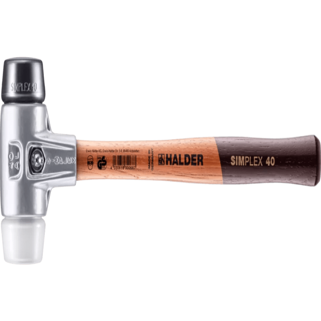 Молоток SIMPLEX с комбинированными ударными головками: резина (чёрная, средняя твёрдость, амортизирующая, без запаха, с низким износом) / суперпластик (белый, средняя твёрдость, очень прочный).