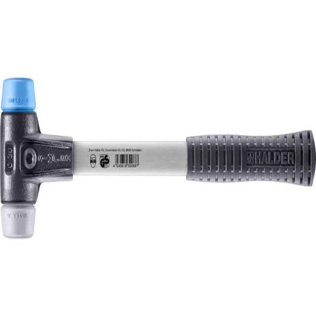 Кувалда с мягкой головкой SIMPLEX с комбинацией бойков: TPE-мягкий (синий, мягкий, не оставляет следов) / TPE-средний (серый, средней твёрдости, не оставляет следов).