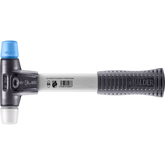 Молоток с мягким бойком SIMPLEX с комбинацией бойков из мягкого TPE (синий, мягкий, не оставляет следов) / суперпластика (белый, средней твёрдости, очень прочный).