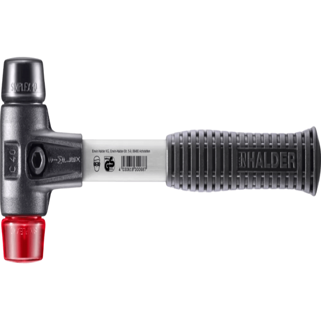 Молоток с мягким бойком SIMPLEX с комбинацией бойков из резиновой композиции (чёрный, средней твёрдости, амортизирующий, без запаха, с низким износом) / пластика (красный, твёрдый, устойчив к маслу и жирам).
