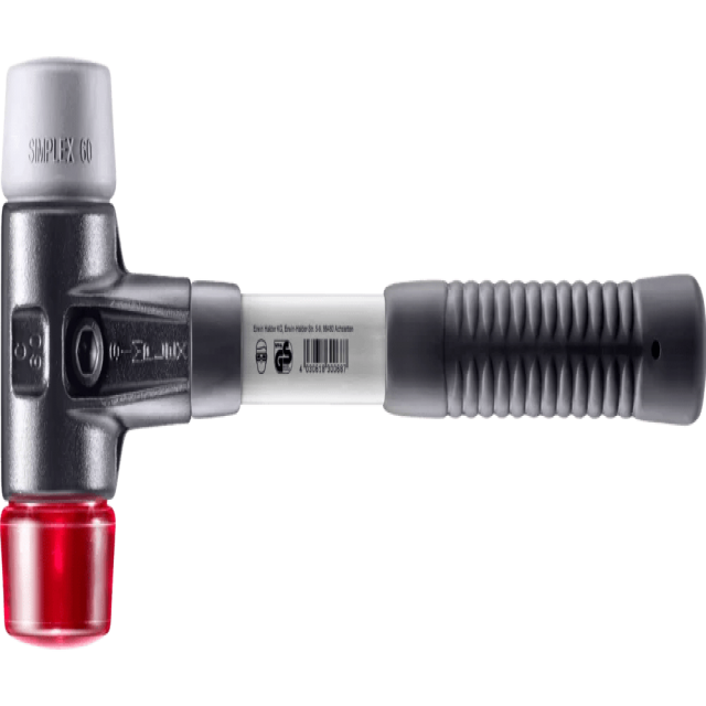 Мягкий молоток SIMPLEX с комбинацией бойков из TPE средней твёрдости (серый, средняя твёрдость, не оставляет следов) и пластика (красный, твёрдый, устойчив к маслу и жирам).