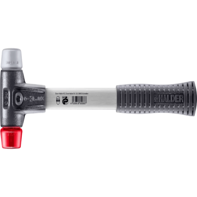 Мягкий молоток SIMPLEX с комбинацией бойков из TPE средней твёрдости (серый, средняя твёрдость, не оставляет следов) и пластика (красный, твёрдый, устойчив к маслу и жирам).