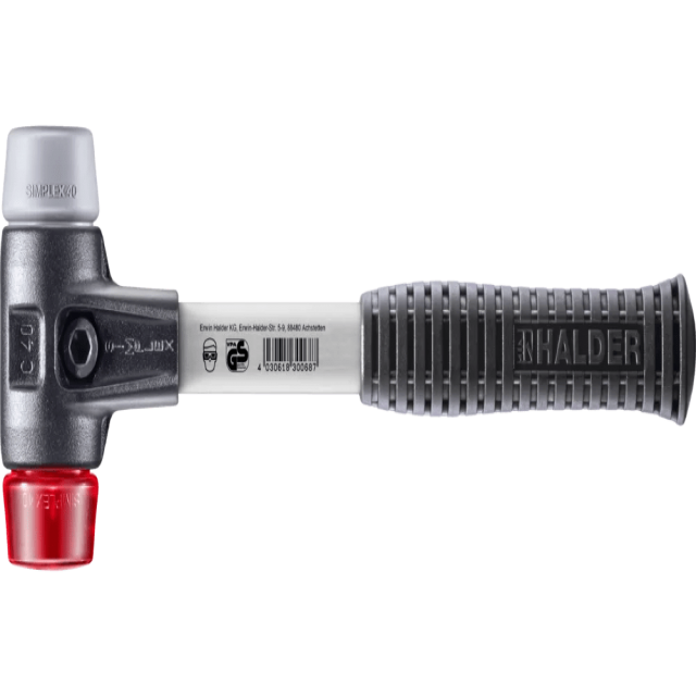 Мягкий молоток SIMPLEX с комбинацией бойков из TPE средней твёрдости (серый, средняя твёрдость, не оставляет следов) и пластика (красный, твёрдый, устойчив к маслу и жирам).