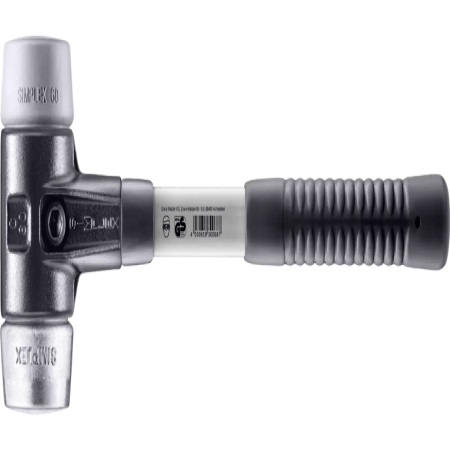 Мягкий молоток SIMPLEX с комбинацией бойков из TPE средней твёрдости (серый, без следов износа) и мягкого металла (серебристый, твёрдый, термостойкий).