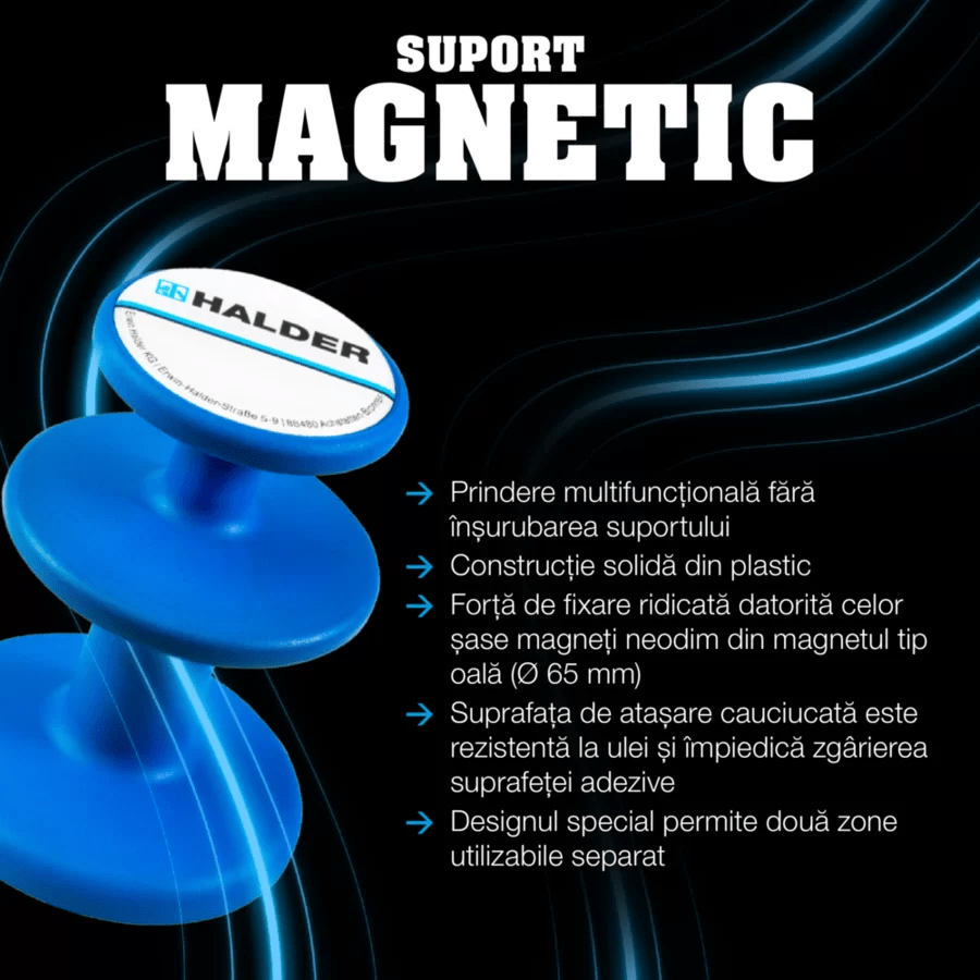 Suportul magnetic solid din plastic are o forţă ridicată de susţinere datorită celor 6 magneţi din neodim din magnetul tip oală (D65mm). Suprafaţa de ataşare cauciucată este rezistentă la ulei şi împiedică zgârierea suprafeţei adezive.