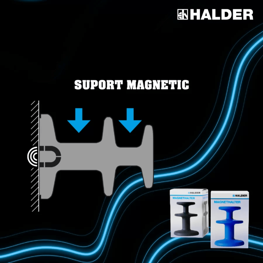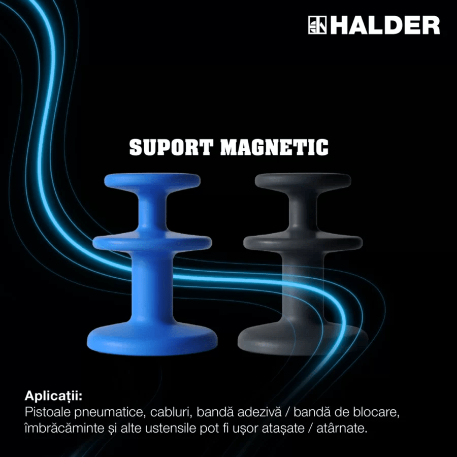 Suportul magnetic Halder este un suport multifuncţional şi flexibil, printre altele, pentru pistoale de suflat, cabluri, furtunuri, îmbrăcăminte, benzi de protecţie şi multe altele. Ustensilele pot fi ataşate / suspendate cu uşurinţă fără a fi nevoie să înşurubaţi suportul.