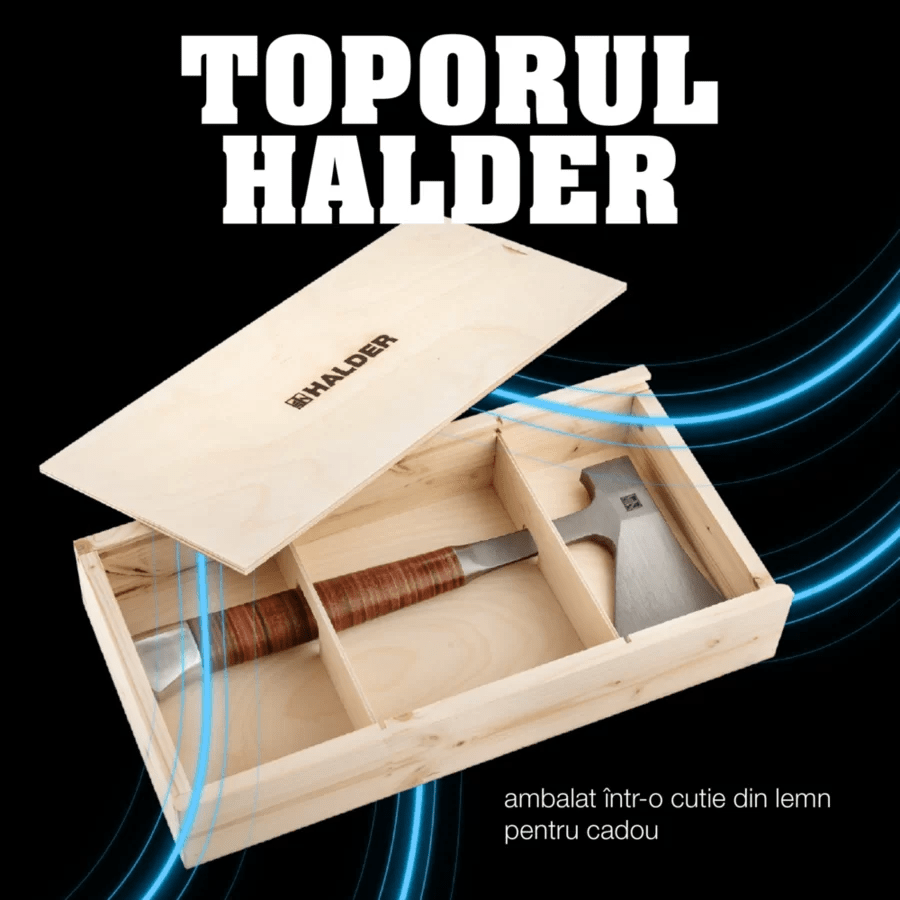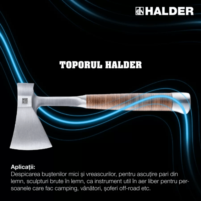 Toporul Halder atrage toate privirile! Această variantă robustă fabricată complet din oţel special tratat termic este forjată dintr-o singură bucată fără cusături, şlefuită foarte fin şi lustruită pe toate părţile. Lama este călită şi ascuţită cu atenţie. Mânerul realizat manual, din piele antiderapantă, nu numai că arată bine, ci pielea şi absoarbe umezeala şi o eliberează din nou după terminarea lucrului. El se adaptează formei mâinii pe parcursul timpului. Toporul de 1.000g este echilibrat perfect pentru o manipulare optimă. O protecţie pentru lamă din piele de înaltă calitate protejează împotriva accidentării în timpul transportului. Cutia atractivă din lemn transformă acest articol într-un cadou foarte valoros.